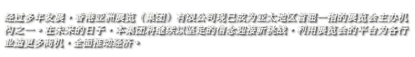 我们一向以提供高效率及专业创造不同之展览会为目标,成功吸引大量本地及海外入场人士,为参展商带来庞大现场销售回报外,并协助拓阔其宣传网络及品牌形象建立,从而加强参展商在本地及海外的业务竞争能力。为求达至展览会质量的保证,我们在筛选参展商方面亦相当严谨,以确保他们的展品产品和服务是高质素的。在举办享誉盛名的结婚节、冬季购物节及美食节的同时,我们亦积极回应市场需求,发掘举办更多主题展览会的可行性。